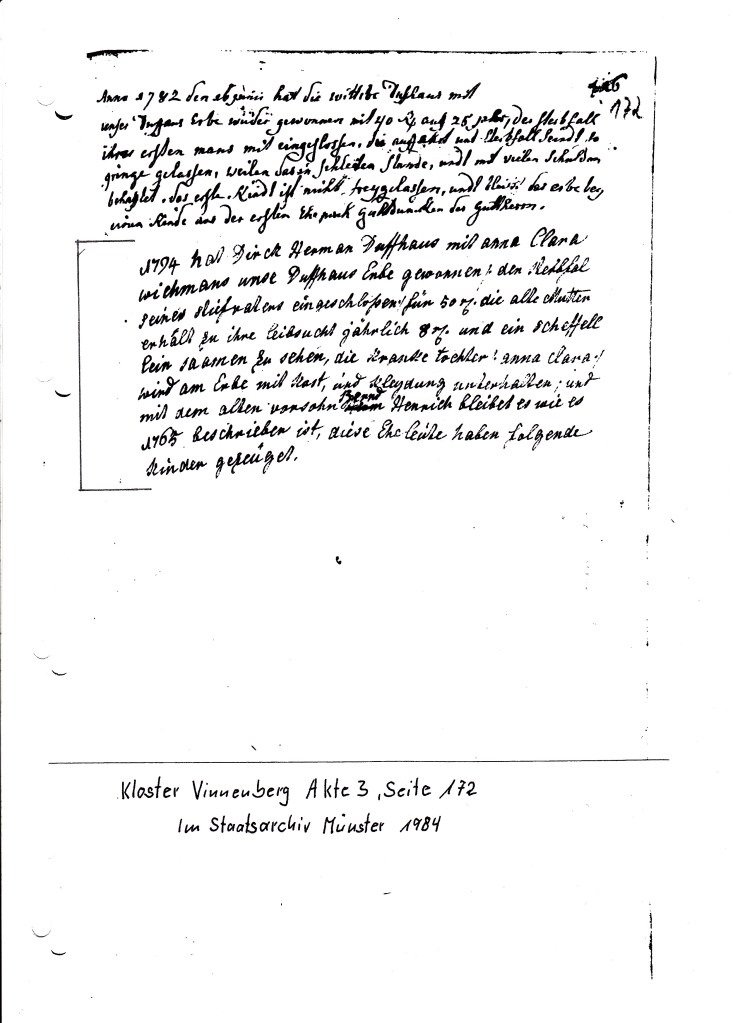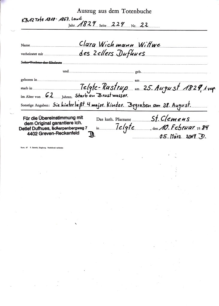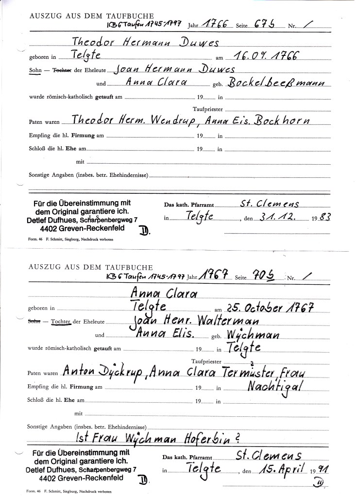 Von Anfang an habe ich mir Abschriften von den Kirchbucheintragungen angefertigt mit genauer Quellenangabe, weil ich nach dem ich angefangen habe zu suchen einen arischen Stammbaum von meinem Vater erhalten habe, den mein Onkel Heinz Dufhues in den Jahren 1933-1939 aufgebaut hat. Er hatte alle Daten mit schriftlichen Belegen von den Kirchen und Ämtern gesammelt, wo mir klar war, das ist nachweisbar.