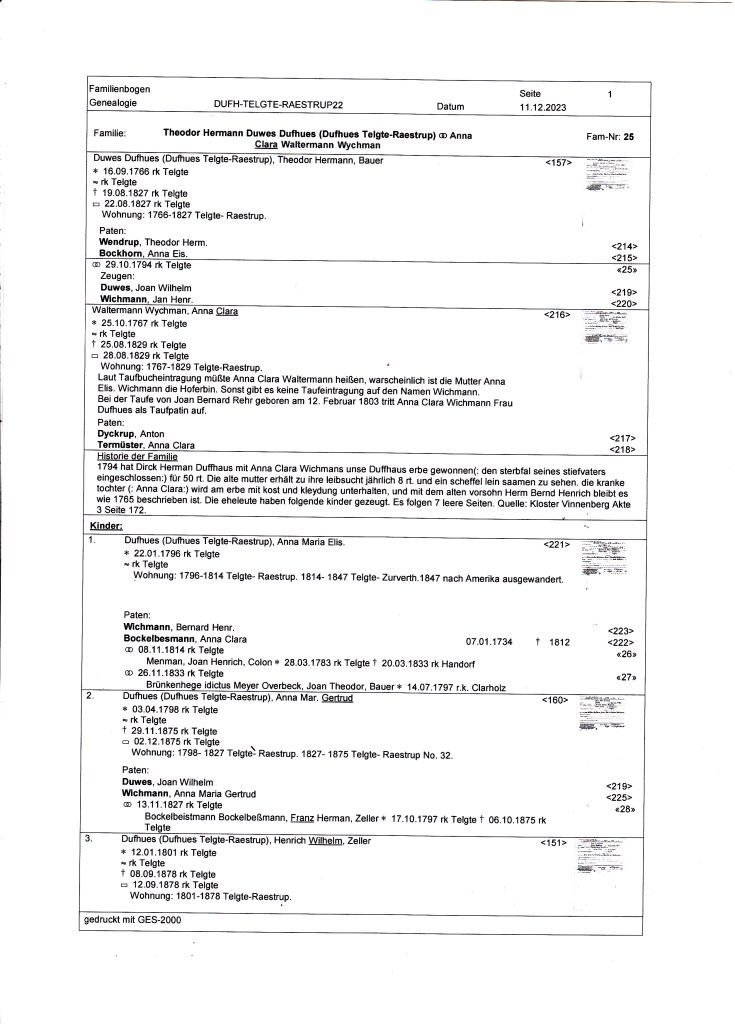 Meine Familienforschung begann 1977 aufgrund, dass ich keine Bilder meiner Vorfahren finden konnte. Am Anfang habe ich nach meinen Vorfahren in Telgte- Stadt gesucht und schnell festgestellt, dass ich die Familie Dufhues in Telgte- Raestrup mit aus den Kirchbüchern raussuchen musste, um sie auseinander halten zu können. Aus diesem Grunde habe ich auf dem Hof angefragt, ob ein Stammbaum vorhanden sei. Es war leider nichts vorhanden und ich bekam die volle Unterstützung vom Hof bei all meinem Suchen und Fragen, mit der Bitte einen Stammbaum für den Hof zu erstellen.